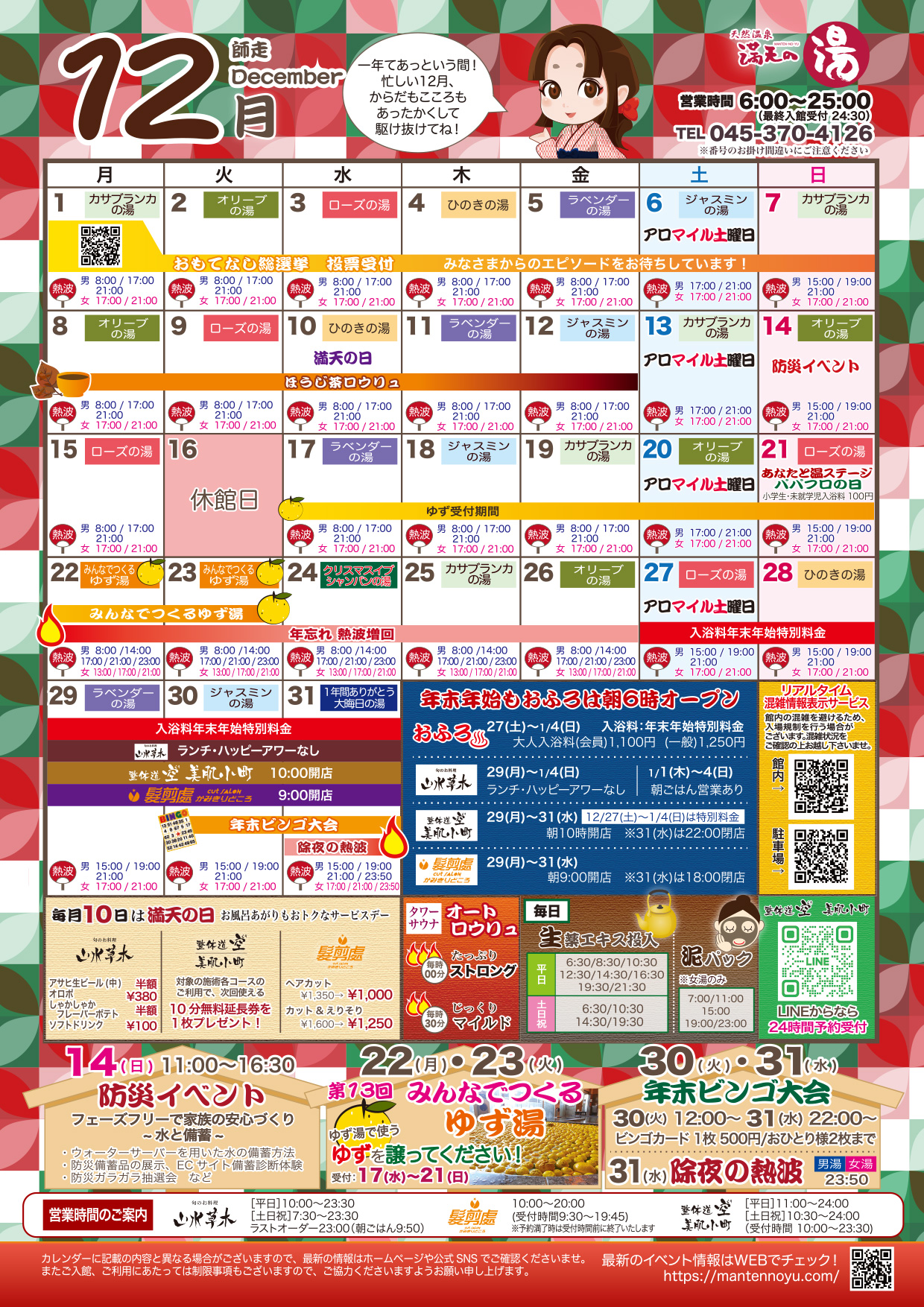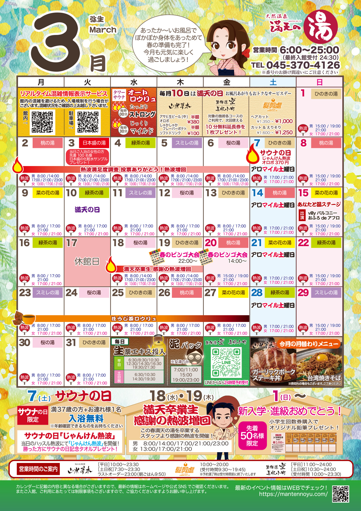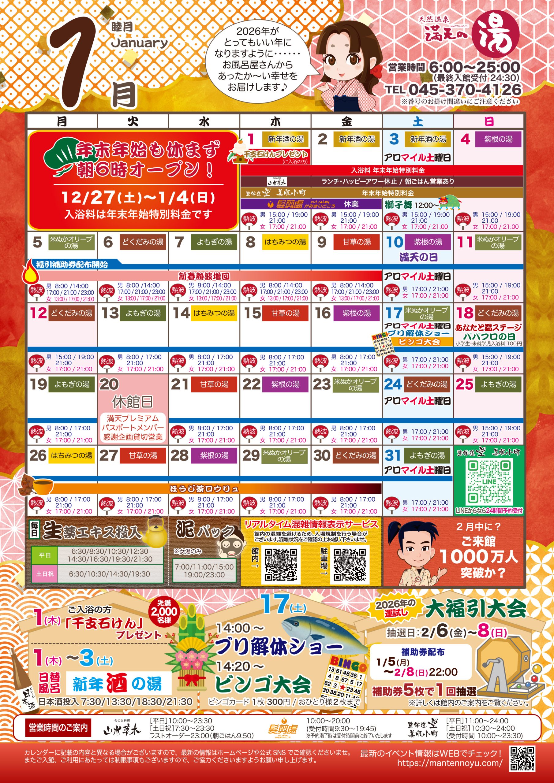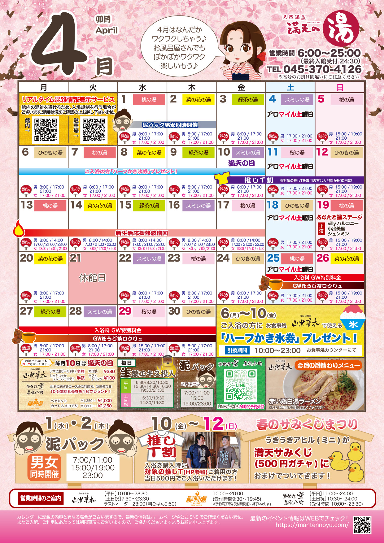 満天の湯は朝6時から営業、イベントも盛りだくさん。おひとり様でもご家族連れでも楽しめます。