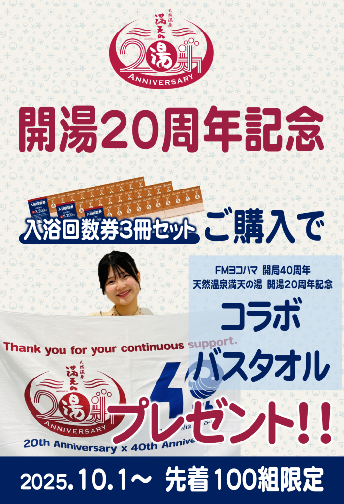 「FMヨコハマ 開局40周年 × 天然温泉満天の湯 開湯20周年 コラボバスタオル」をプレゼントいたします!