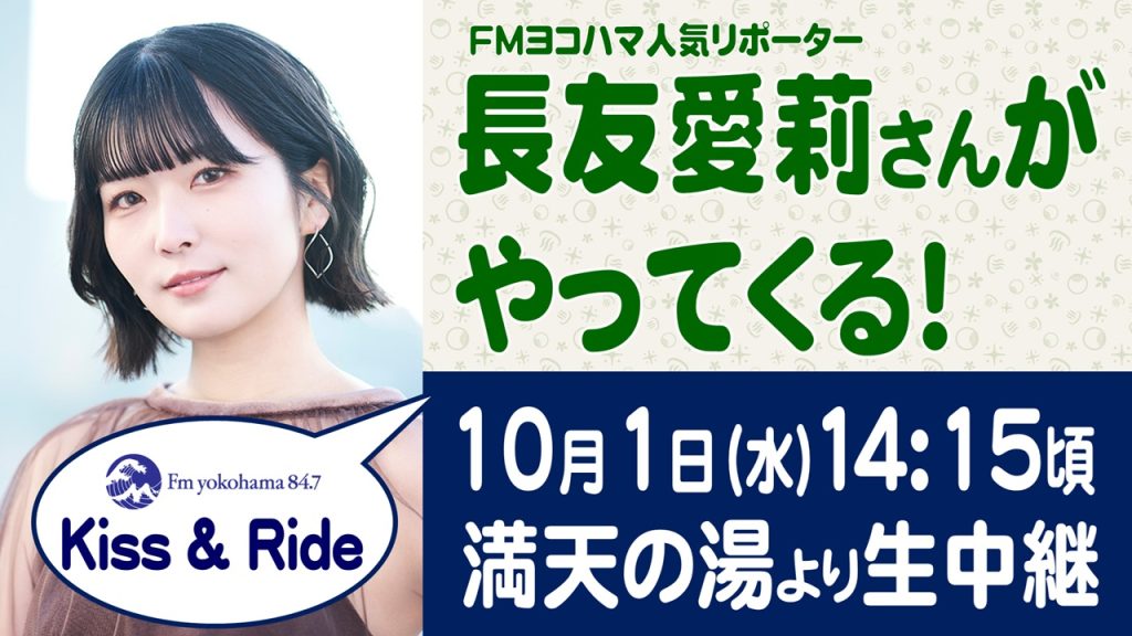 10/1(水)14:15頃、FMヨコハマ「Kiss&Ride」内の中継で、長友愛莉さんが満天の湯にやってきます!