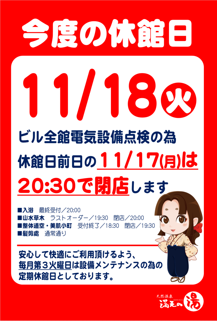 11/17(月)はビル全館設備点検のため20:30で閉店します。