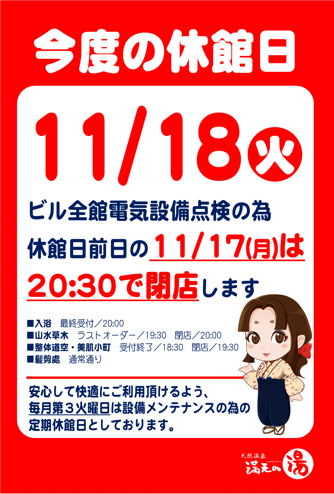 翌11/18(火)は館内メンテナンスのため定期休館日です。