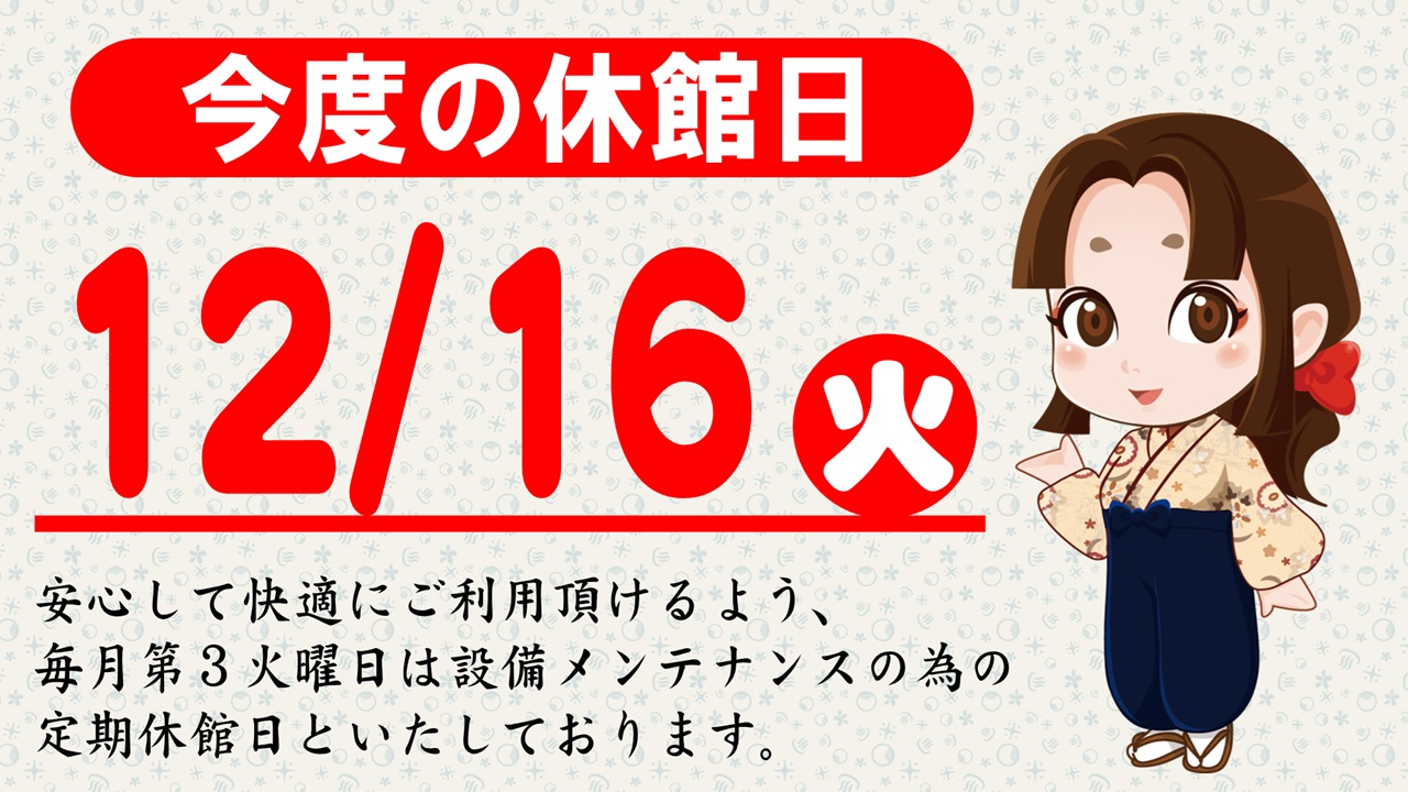 皆様に安心してご利用いただけるよう、毎月第3火曜日は設備メンテナンスのため定期休館日といたしております。